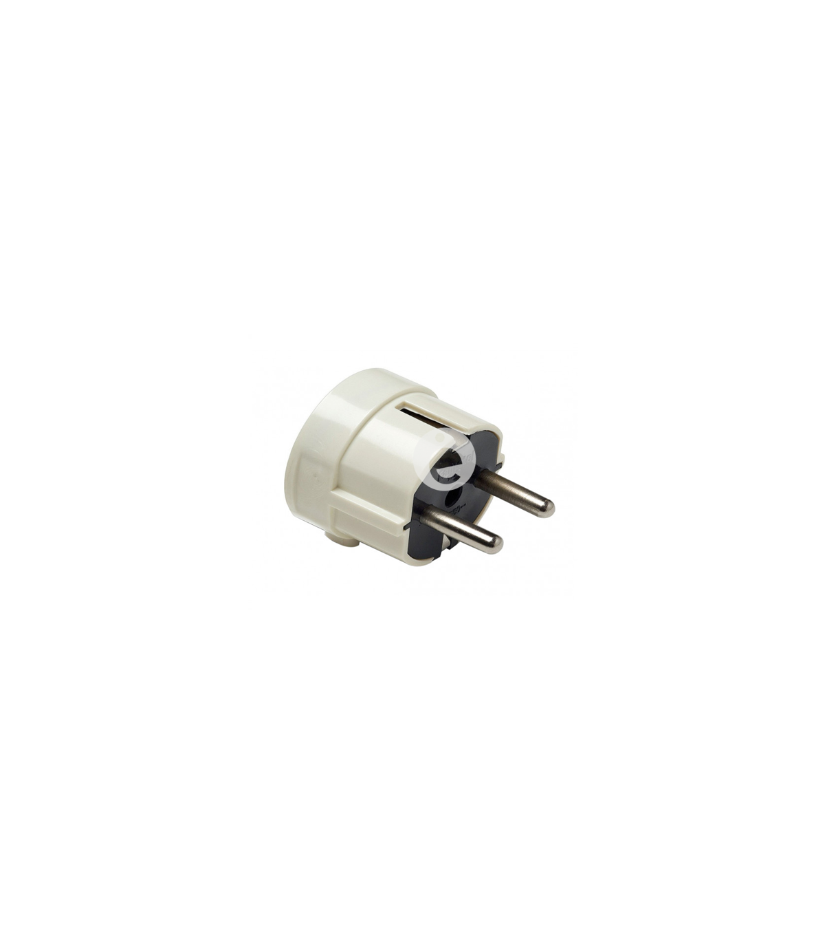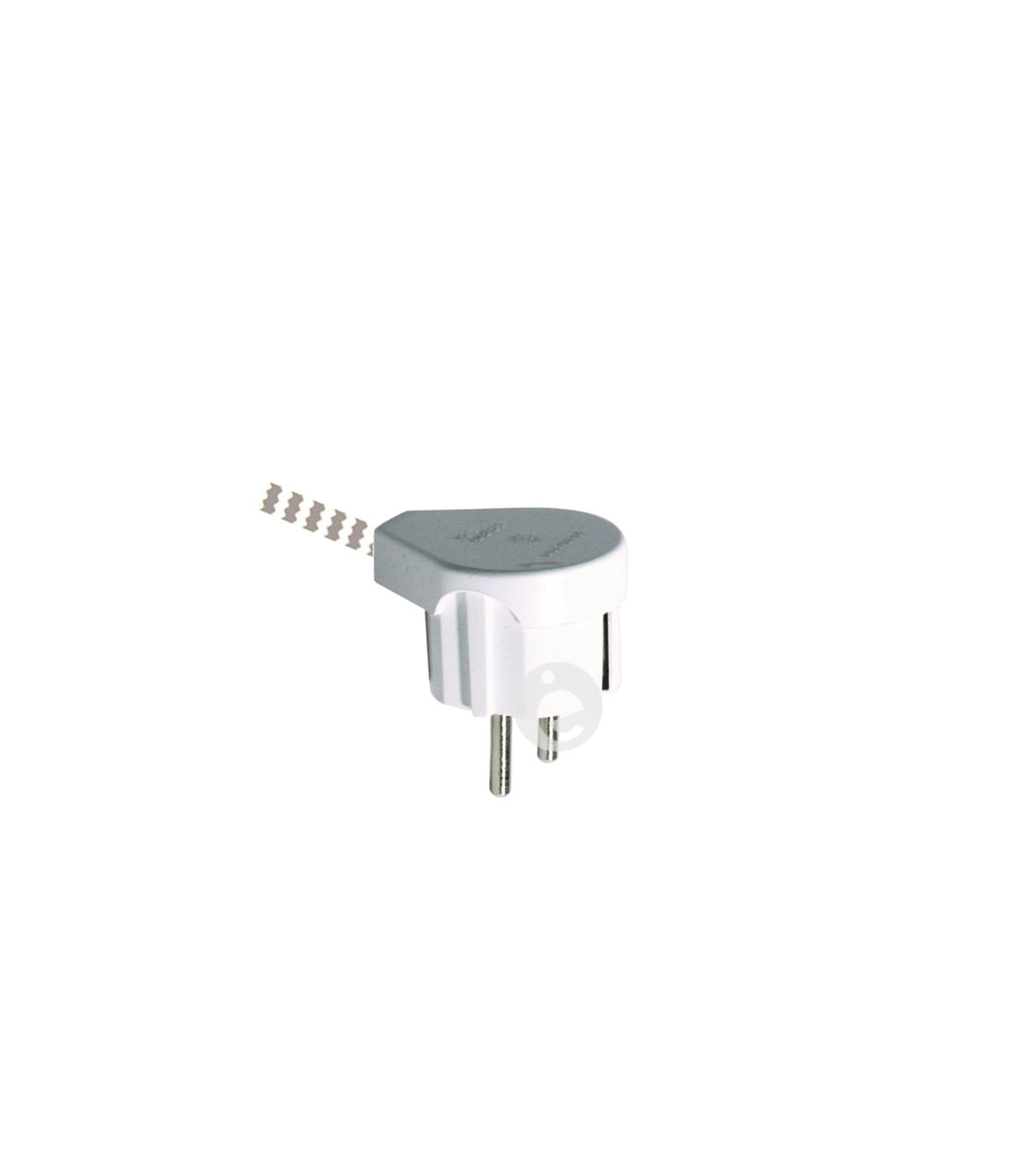 Clavija blanca aérea bipolar 16 A 250V termoplástico plana, con entrada de cable lateral, perfecta para cuando necesitamos que no sobresalga de la pared. En color blanco y negro
