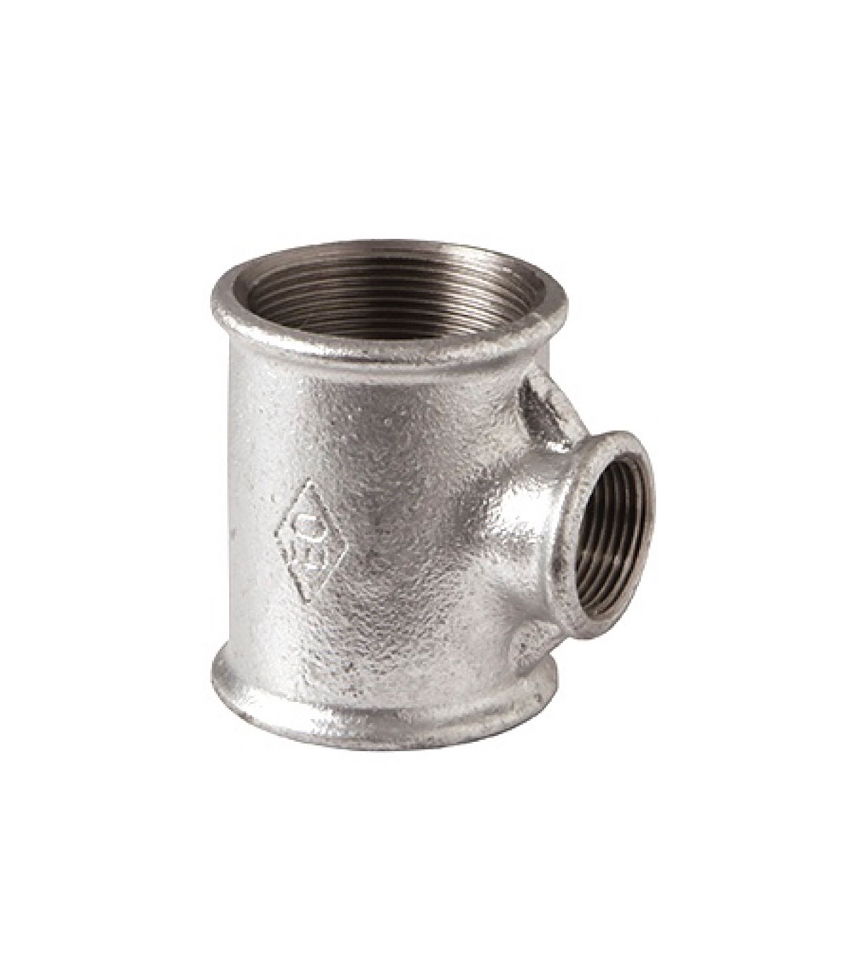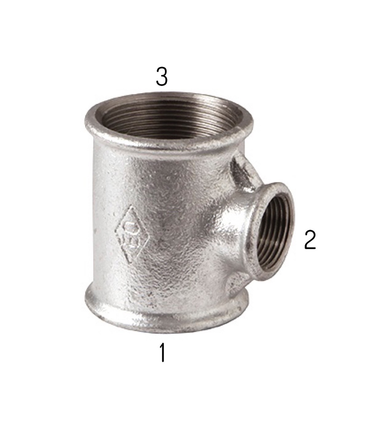 Pieza en T reductora hembra 1 de 3/4, hembra 2 de 3/4 y hembra 3 de 1/2 galvanizada.