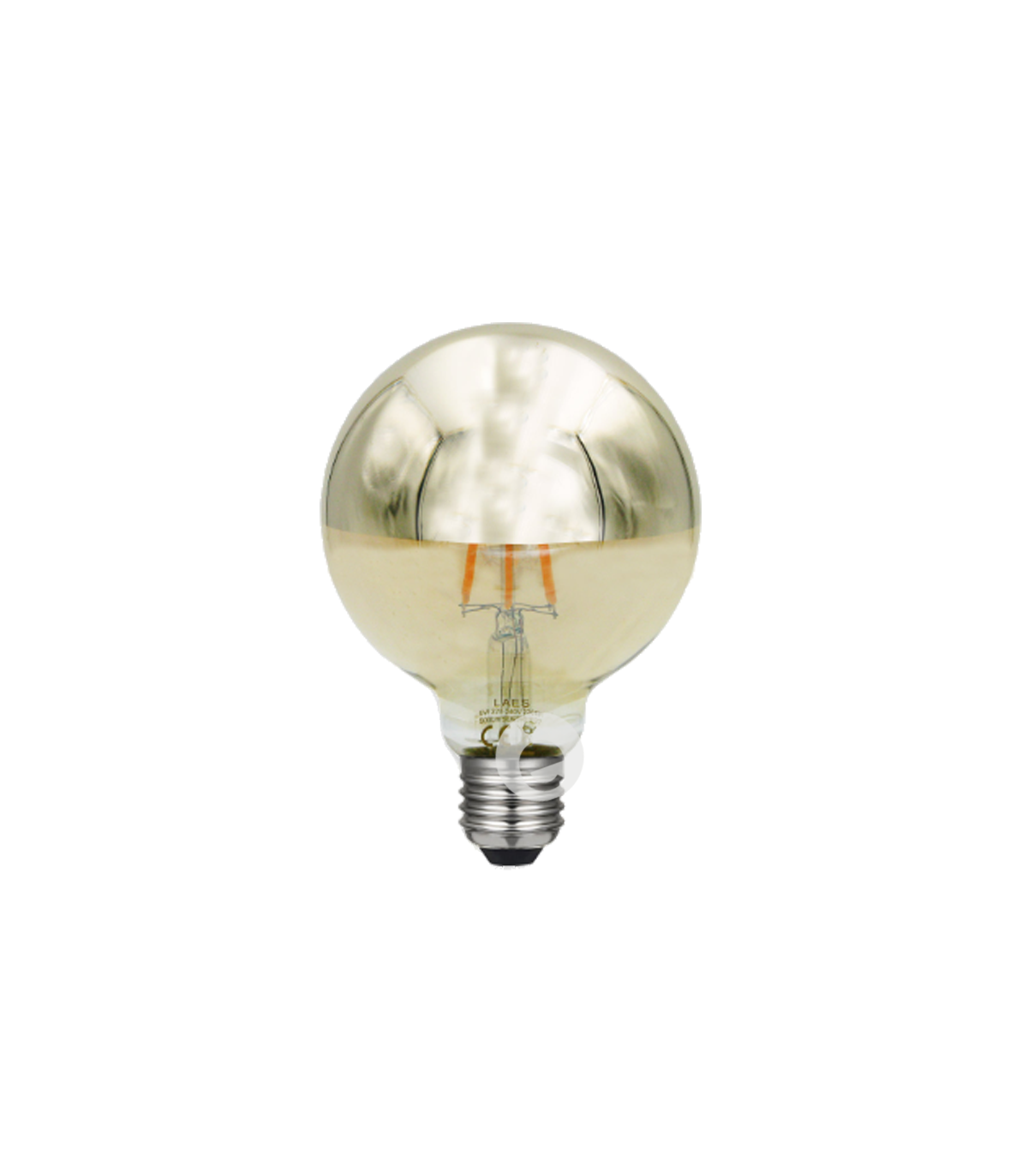 Bombilla led cúpula de oro G95 6 W equivalente a 48 W. Muy eficiente A+, flujo lumínico alto 500 lm. Bombilla ideal para retroiluminar espacios. Regulable con reguladores de led.