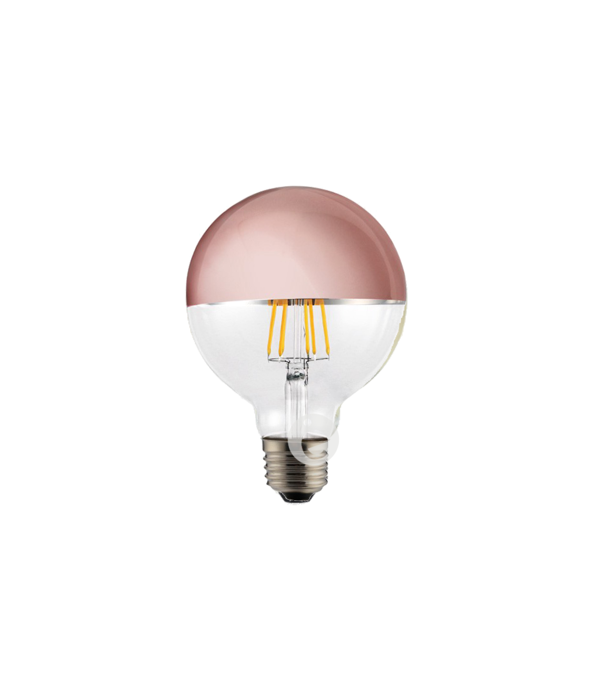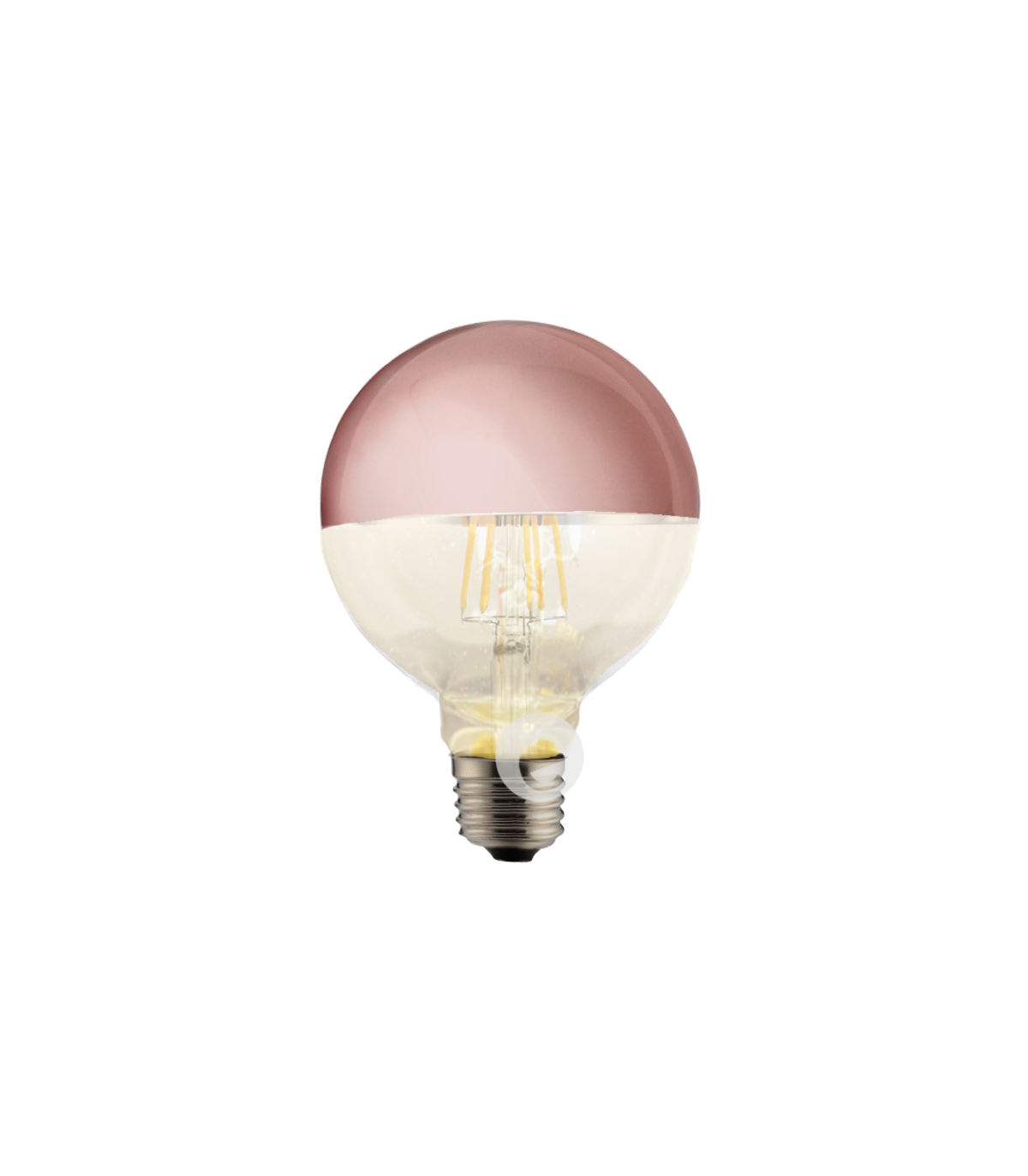 Bombilla LED de 95 mm de díametro con media cúpula de efecto espejo en cobre. Bombilla vintage de filamentos LED, con luz cálida de 2700K, 6w de potencia y 700 lúmenes. (alta luminosidad)