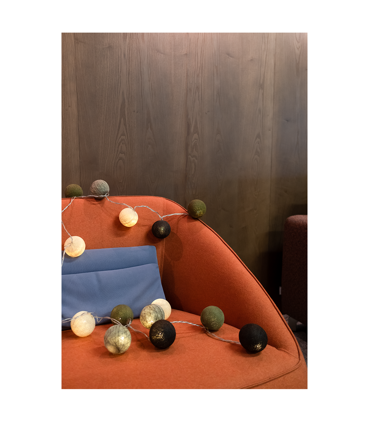 Caja de 20 bolas con 20 bolas en tonos naranjas inspirada en la playa surfera de Famara. La longitud del cable con bolas es de 2,70 cm, con 14 cm de distancia entre las bolas y 1,5 m de longitud del cable hasta la clavija. El cable es transparente, incluye interruptor y clavija.