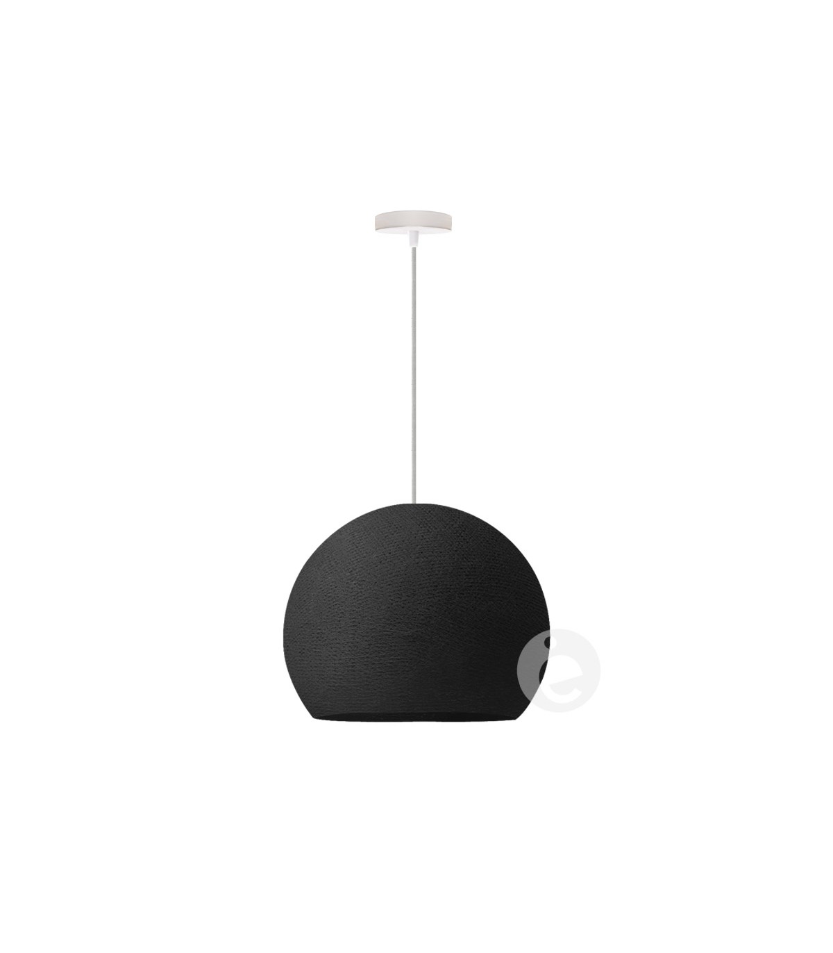 Pantalla cúpula de hilo color negro, diámetro 36 cm. La bola se suministra doblada, con un globo para proceder a su inflado y montaje. Aunque es muy fácil, no olvides descargarte las instrucciones de nuestra web. Incluye casquillo E27 y soporte para casquillo. Visita el apartado de cables para elegir el tuyo y el soporte de techo. Se recomienda utilizar bombilla de led.