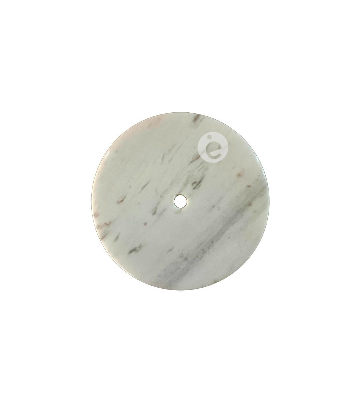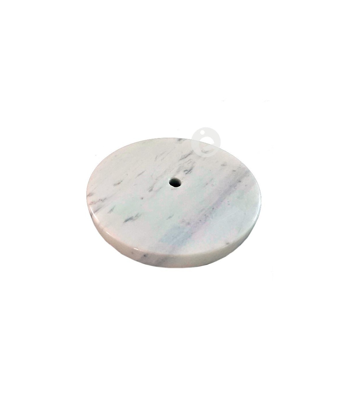 Base de mármol blanca para pie de lámpara, 159 mm de diámetro y 19 mm de altura, con agujero central M10 y ranurado para pase de cable.