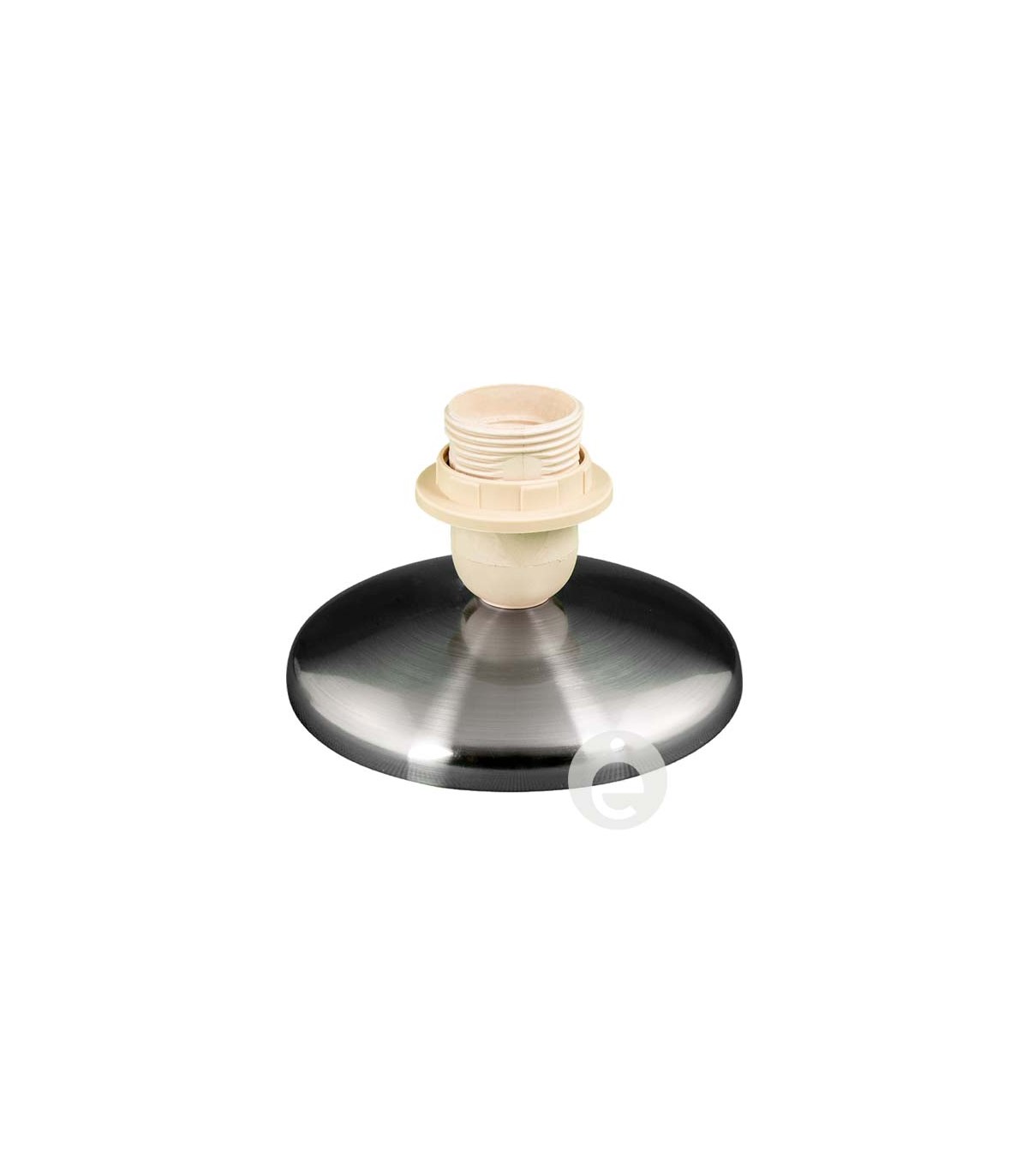 Base níquel con casquillo termoplástico E27, cable pvc, interruptor y clavija. Altura 9 cmy diámetro 13,5 cm. Para bombilla E27 max 40 W.