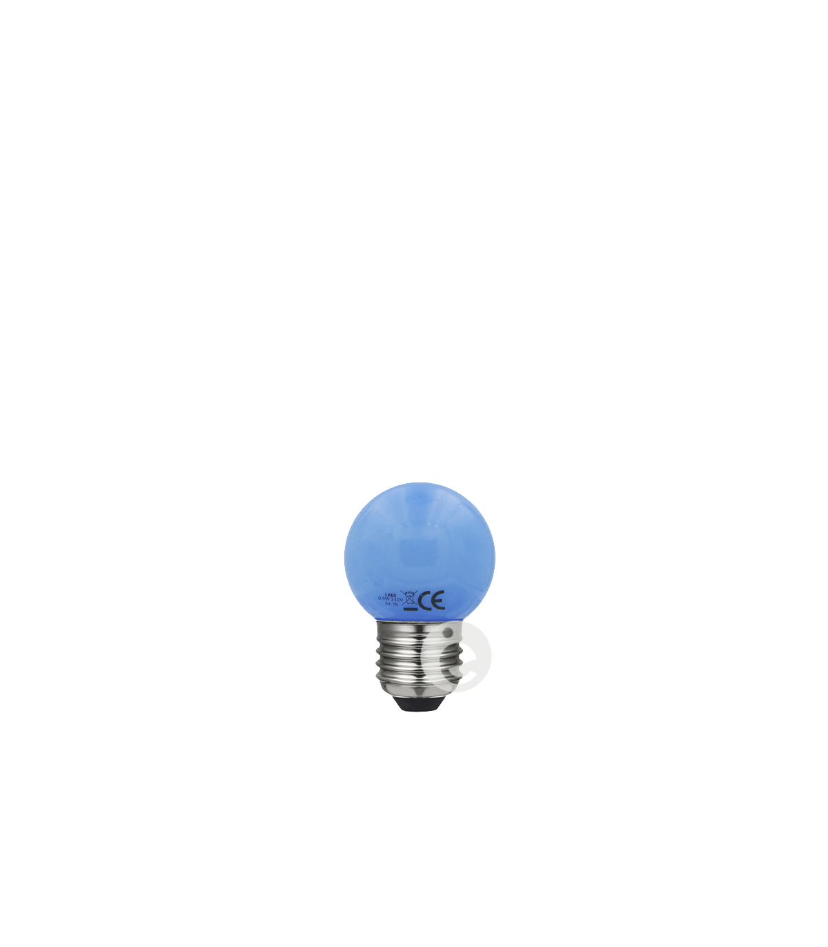 Ampoule LED sphérique LED bleue 0,9 W, 240 V E27. Ampoule efficace à faible luminosité, Dimensions 45 mm x 73 mm, parfaite pour une installation dans les festivals.