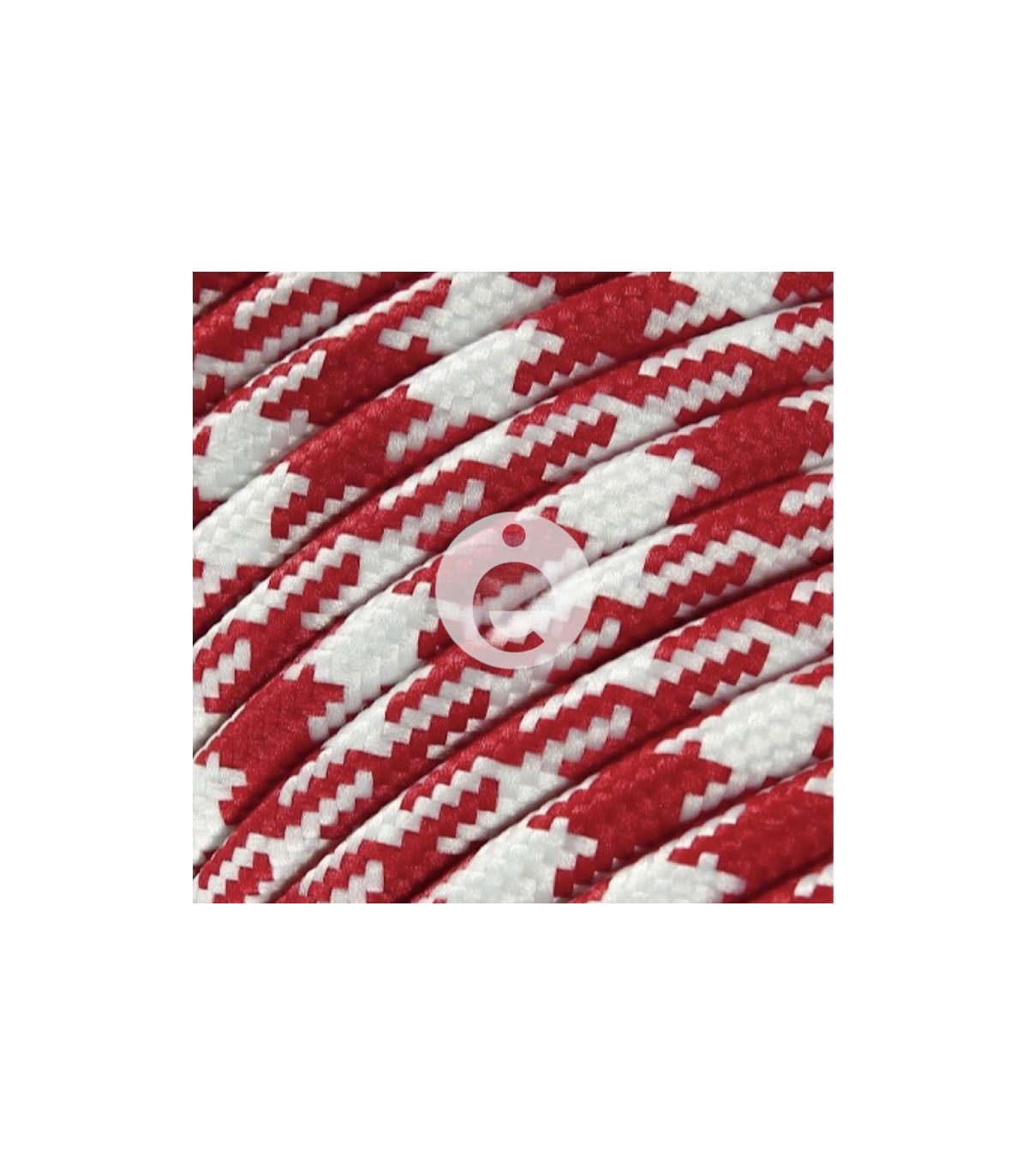 Câble électrique rond 2x0,75 mm recouvert d’un tissu blanc rouge pied-de-poule effet brillant.