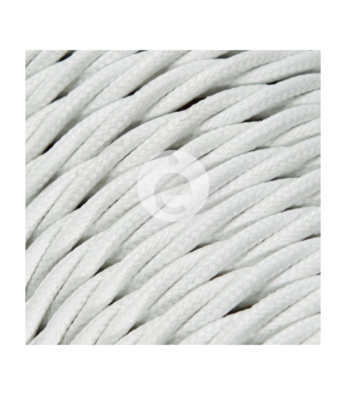 Câble électrique tressé 2x0,75 mm recouvert d’un tissu blanc effet brillant.