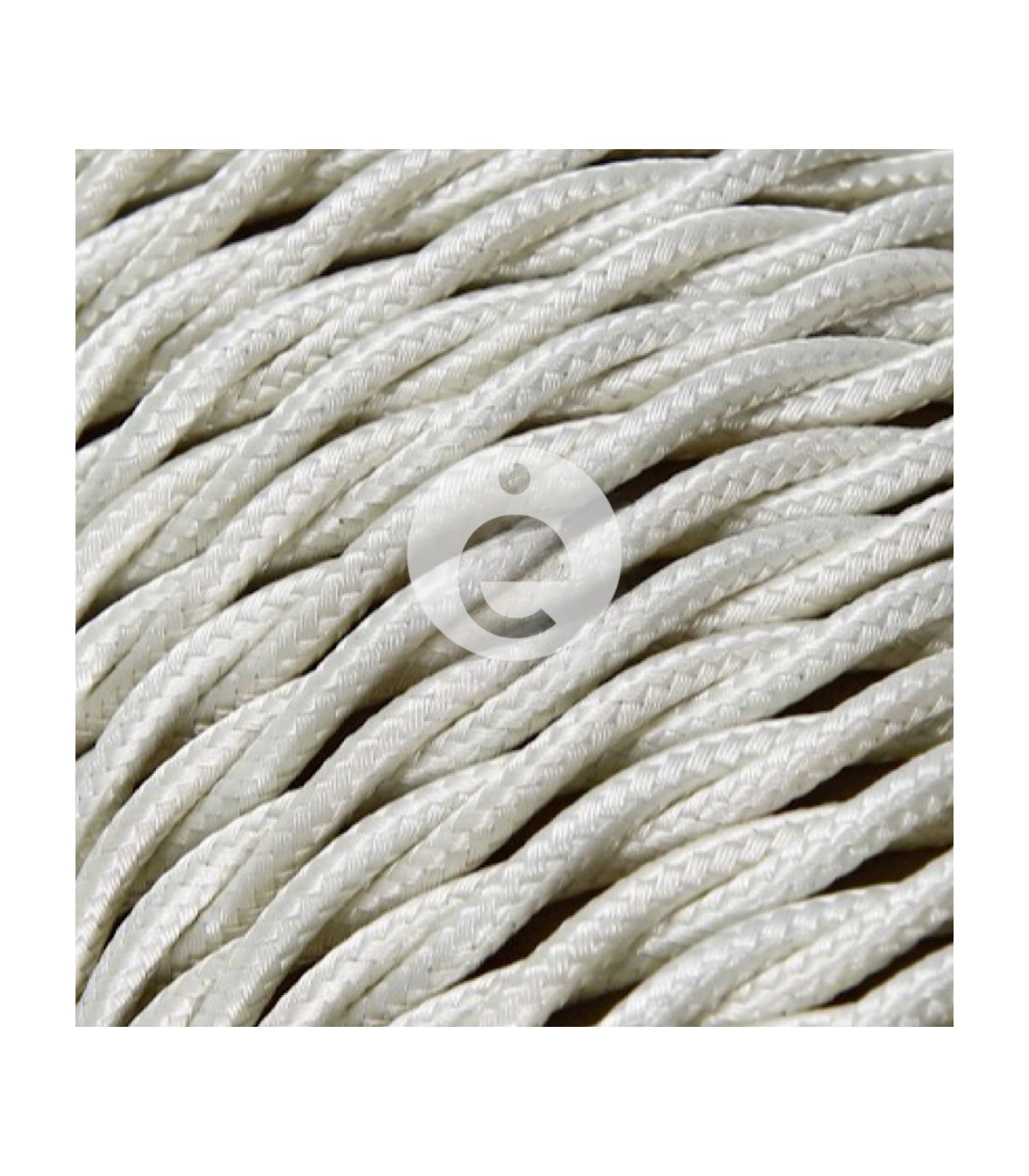 Câble électrique tressé 2x0,75 mm recouvert d’un tissu effet brillant ivoire.
