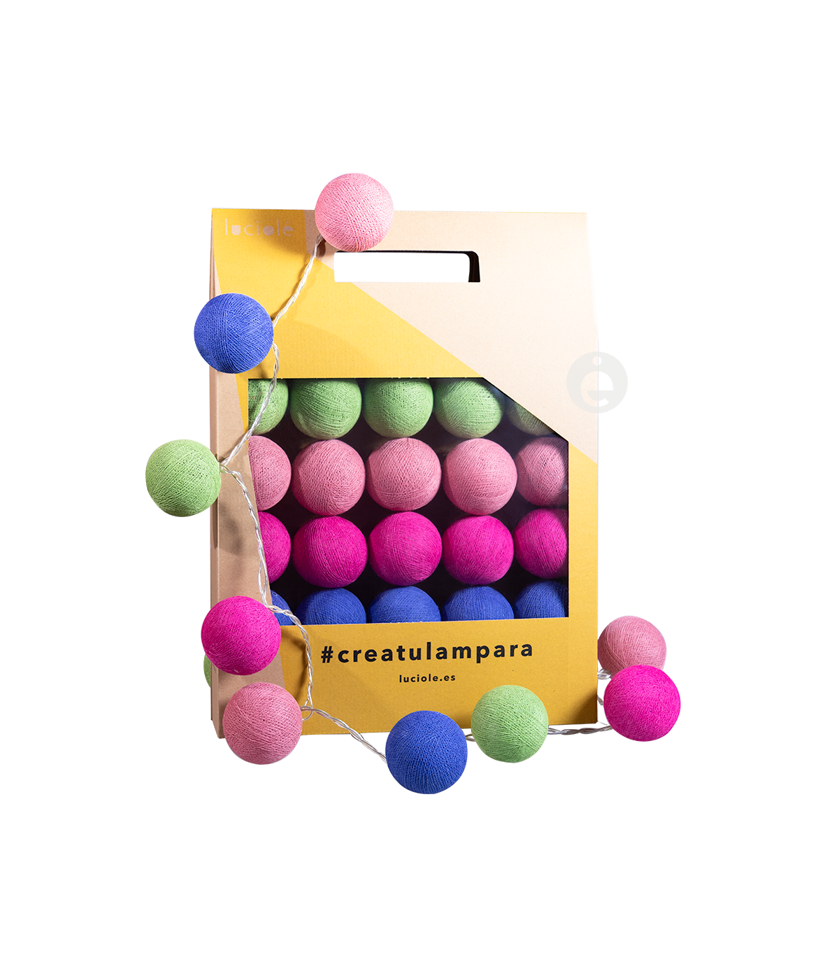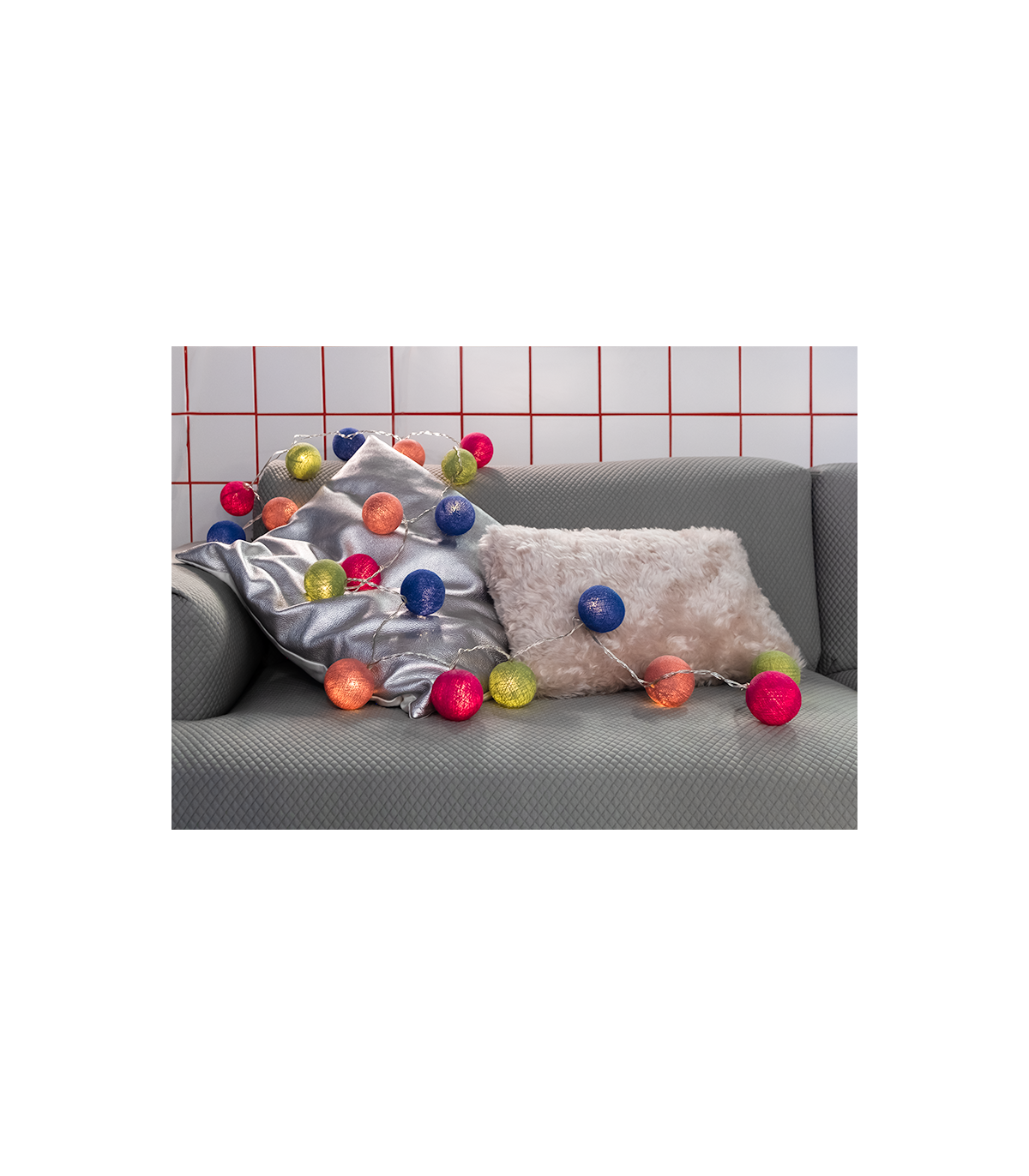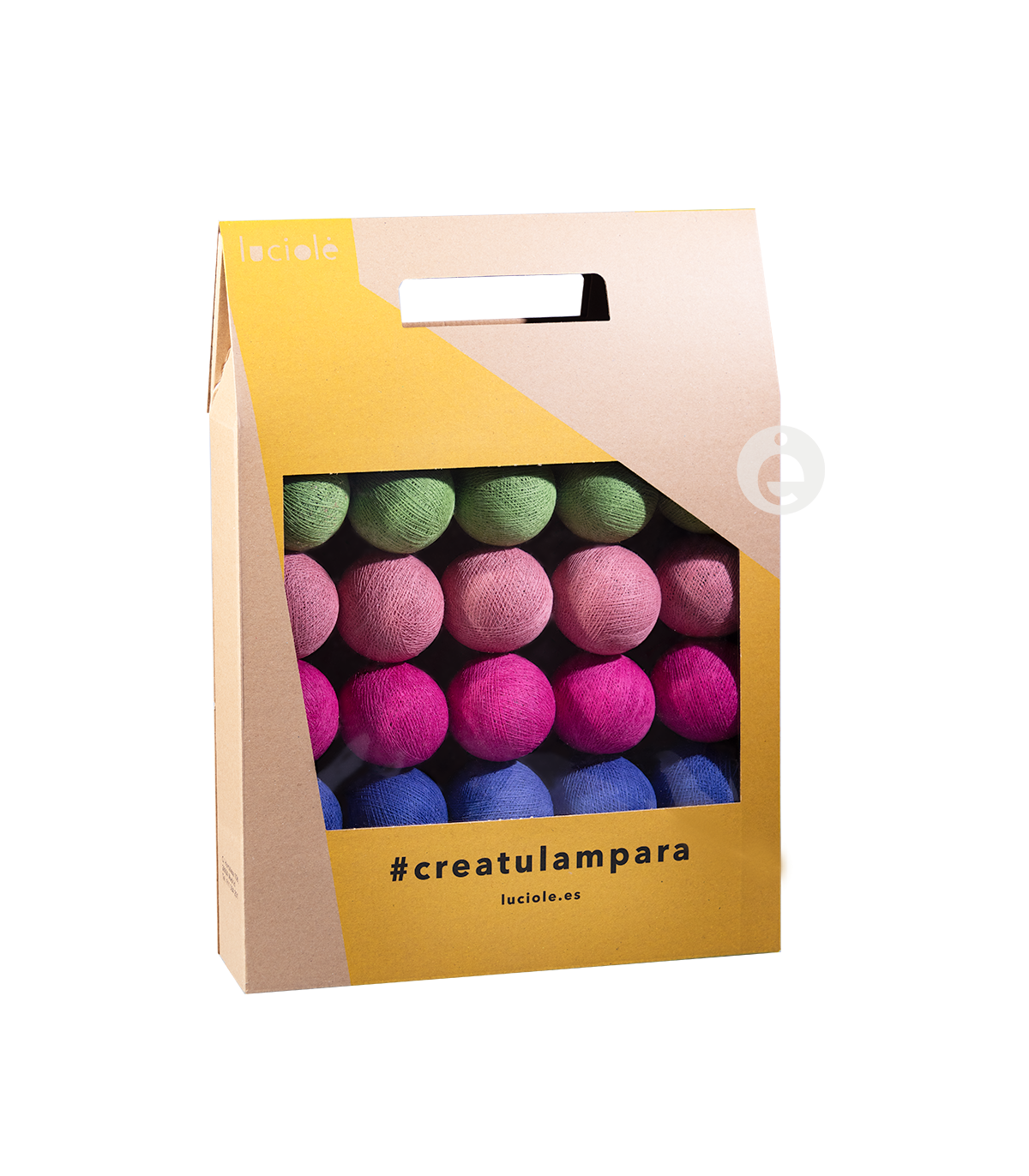 Boîte de 20 balles avec 20 balles dans des tons orangés inspirés des plages de Cadix. La longueur du câble avec billes est de 2,70 cm, avec une distance de 14 cm entre les billes et 1,5 m de longueur de câble jusqu’à la fiche. Le câble est transparent, comprend un interrupteur et une prise.