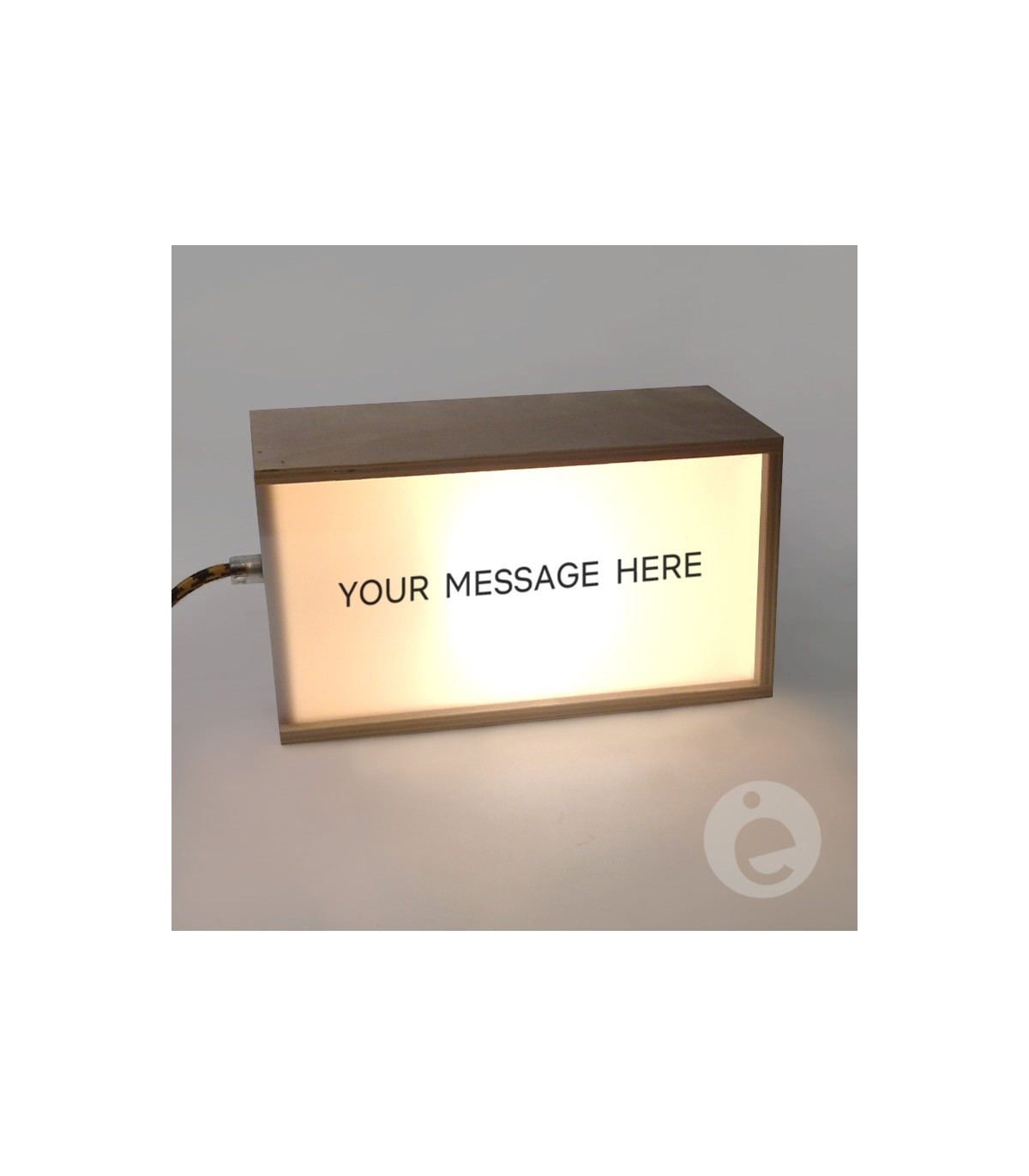 Petite boîte en bois de 25x14x9 cm comprenant une douille E27 et un presse-étoupe, n’oubliez pas de choisir un bouton de câble, à côté de l’ampoule, de la prise et de l’interrupteur. Ecrivez un message sur le méthacrylate ou mettez une jolie photo qui sera illuminée. C’est un cadeau très spécial. Nous recommandons l’ampoule en verre standard 17PHI419656 car elle ne projette pas d’ombres ;)