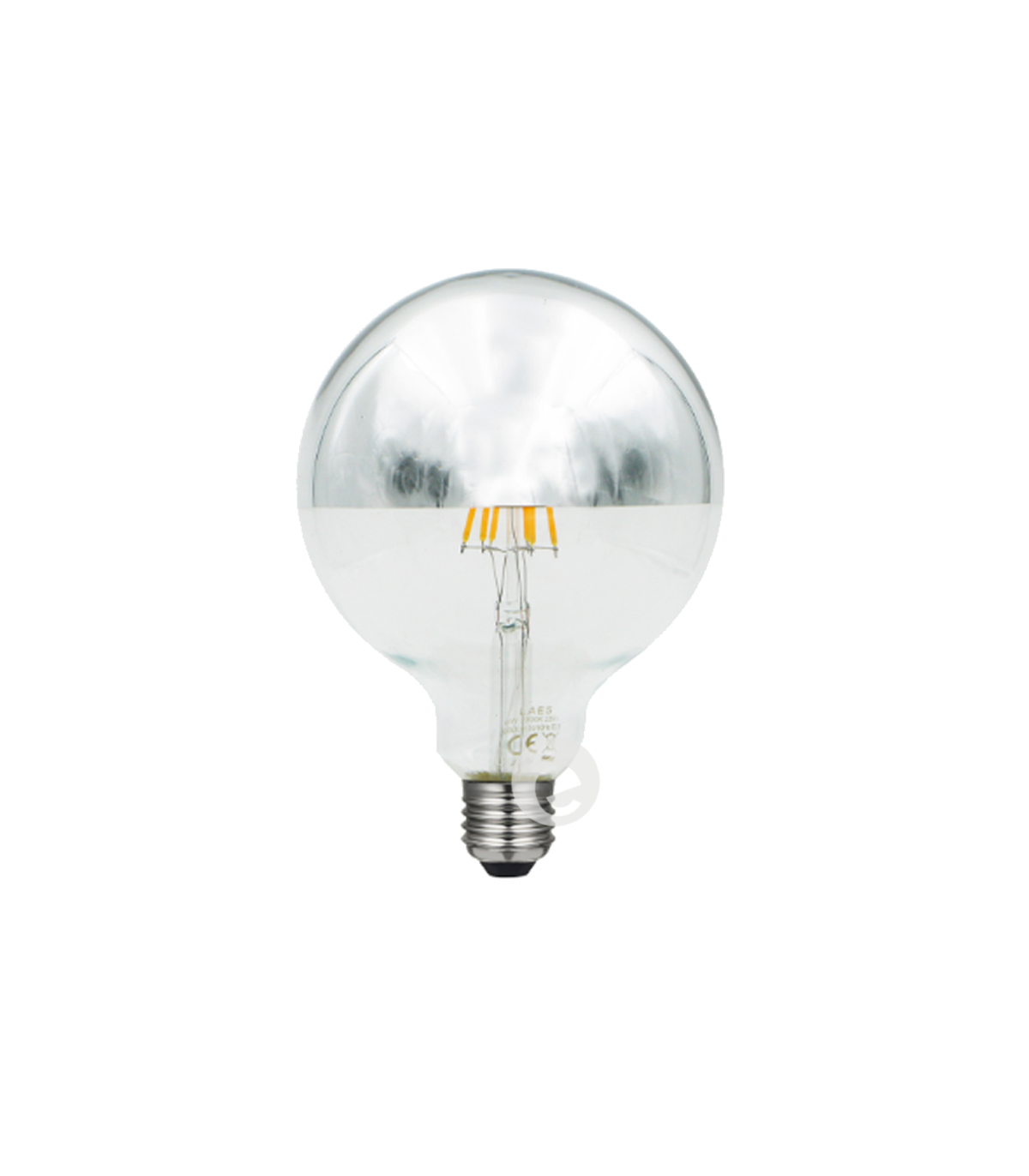 Silver LED dome bulb G125 6 W equivalent to 48 W. Very efficient A+, high luminous flux 600 lm. Ideal bulb for backlighting spaces.