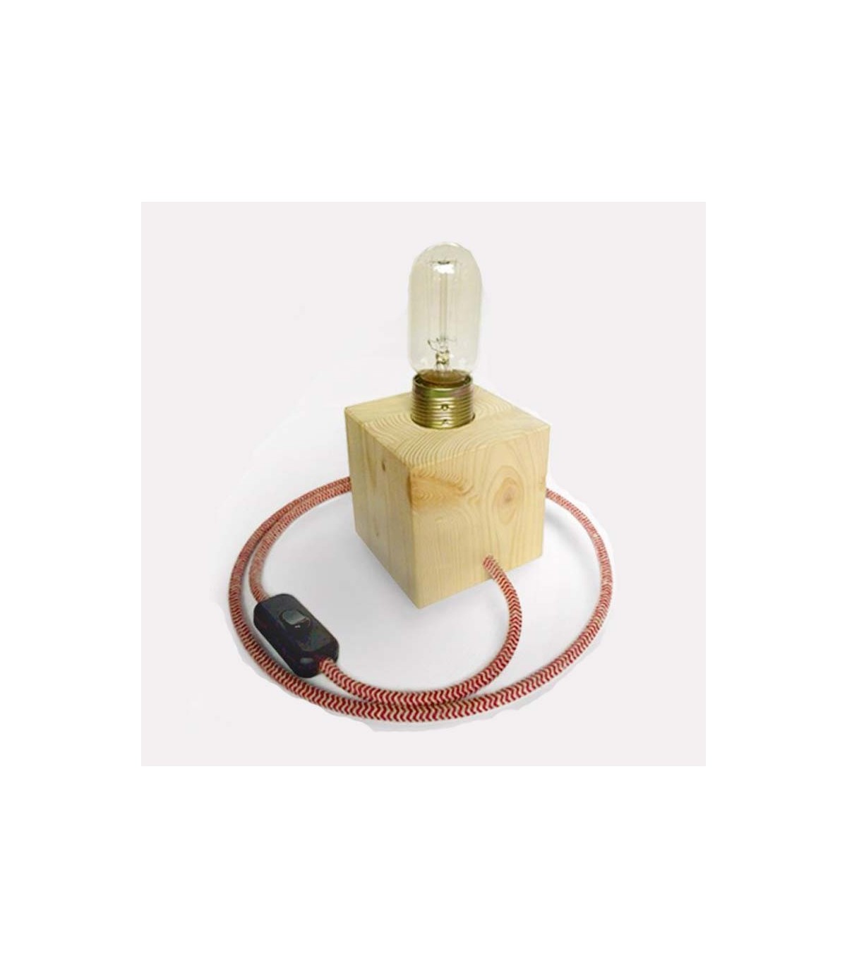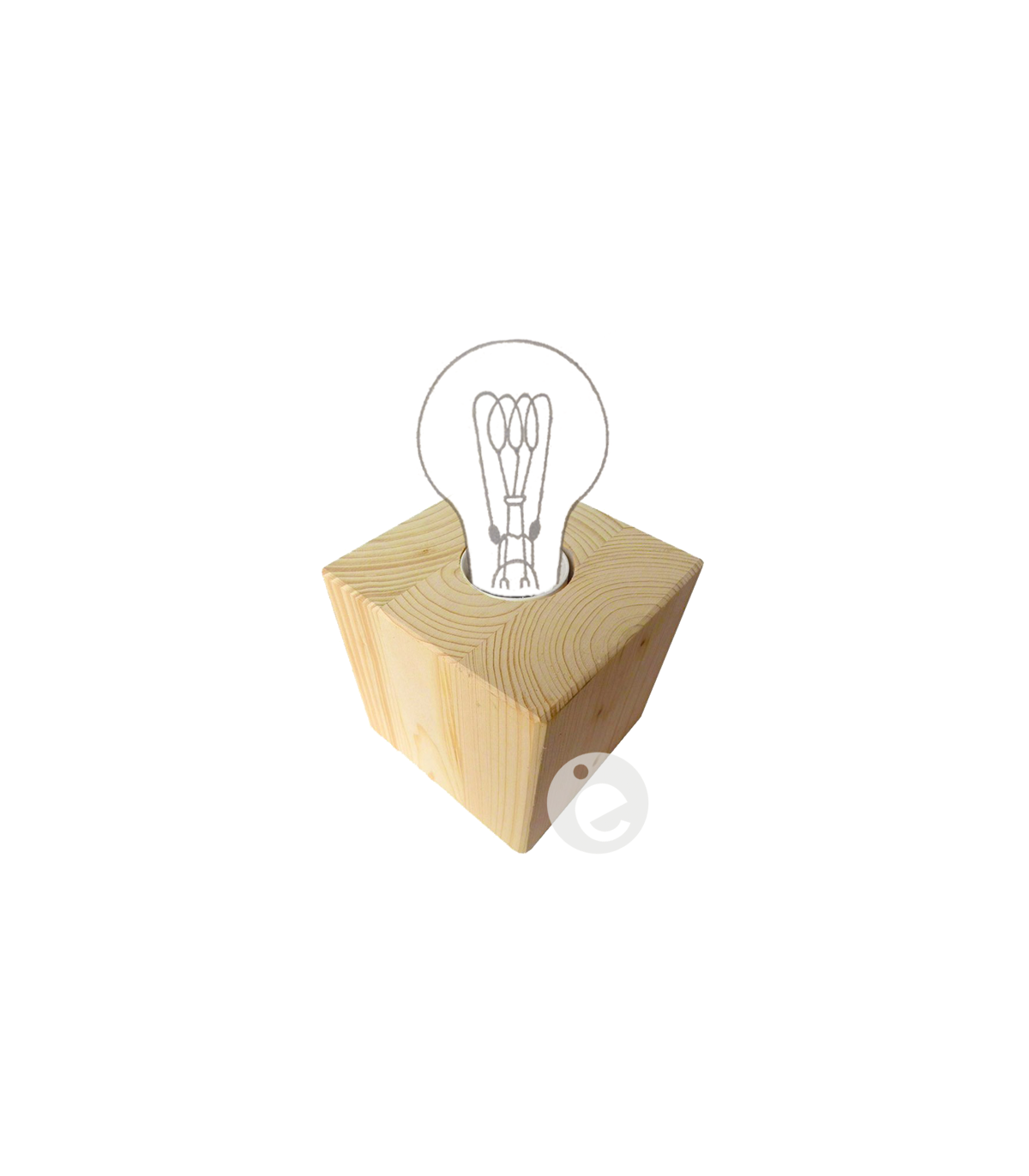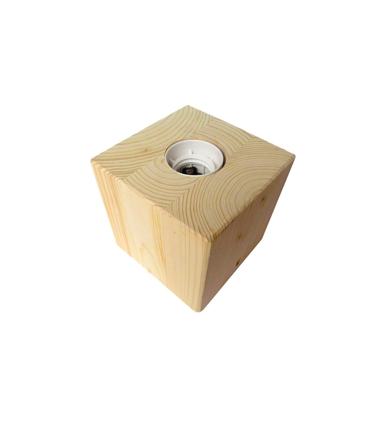 Natural wood dowel lamp. Width 98mm, depth 98mm and height 104mm. Includes E27 thermoplastic lamp holder, pitch thread and nut. The lamp holder is concealed inside the hole. Allows for primer treatments.