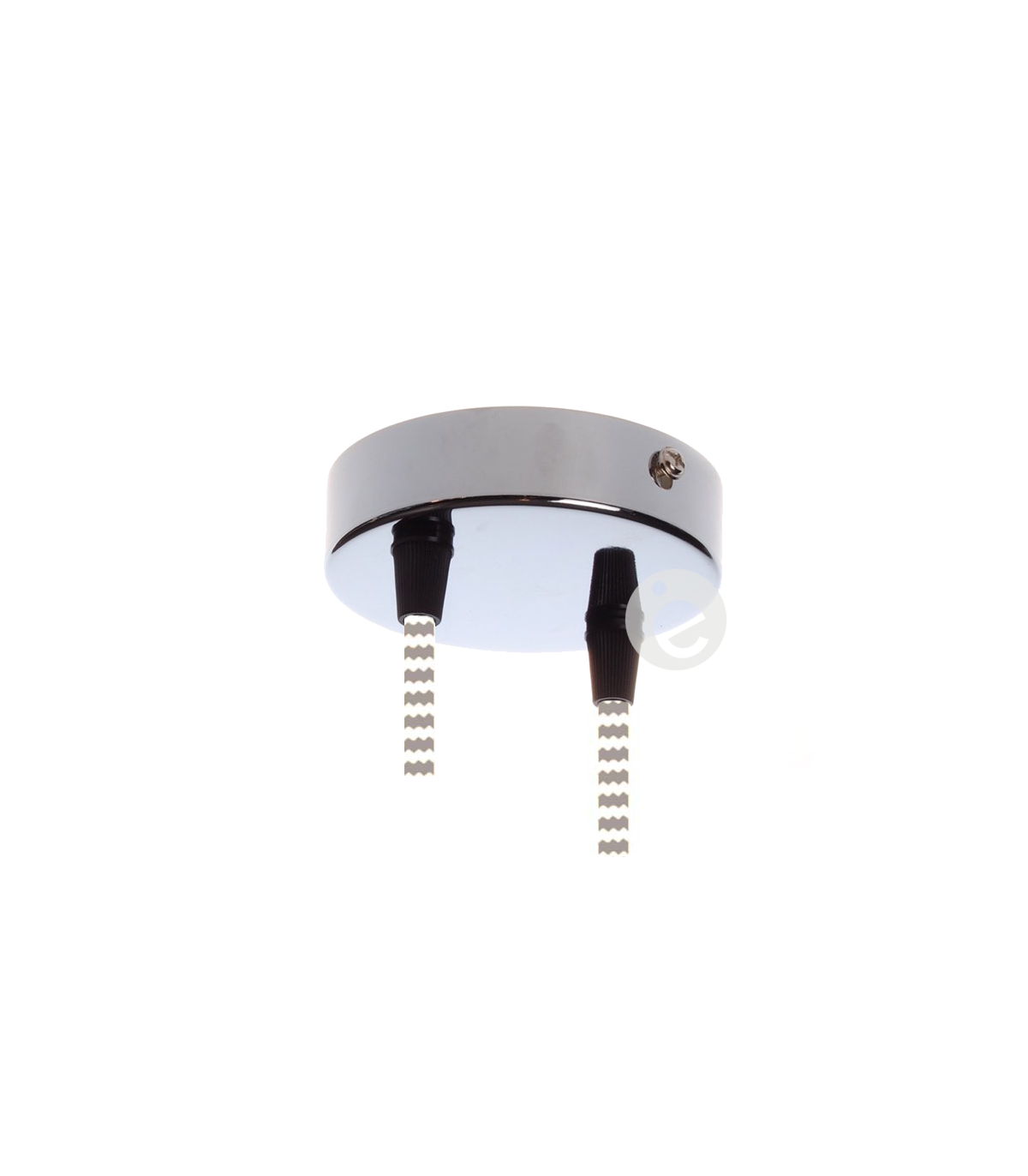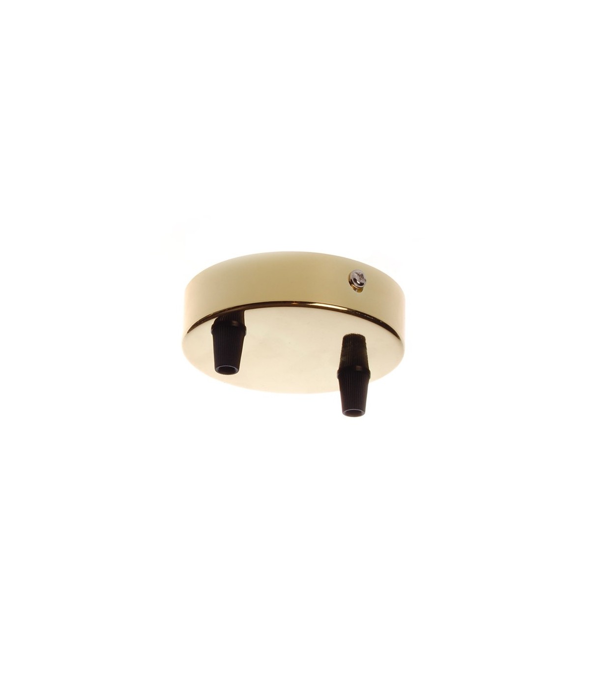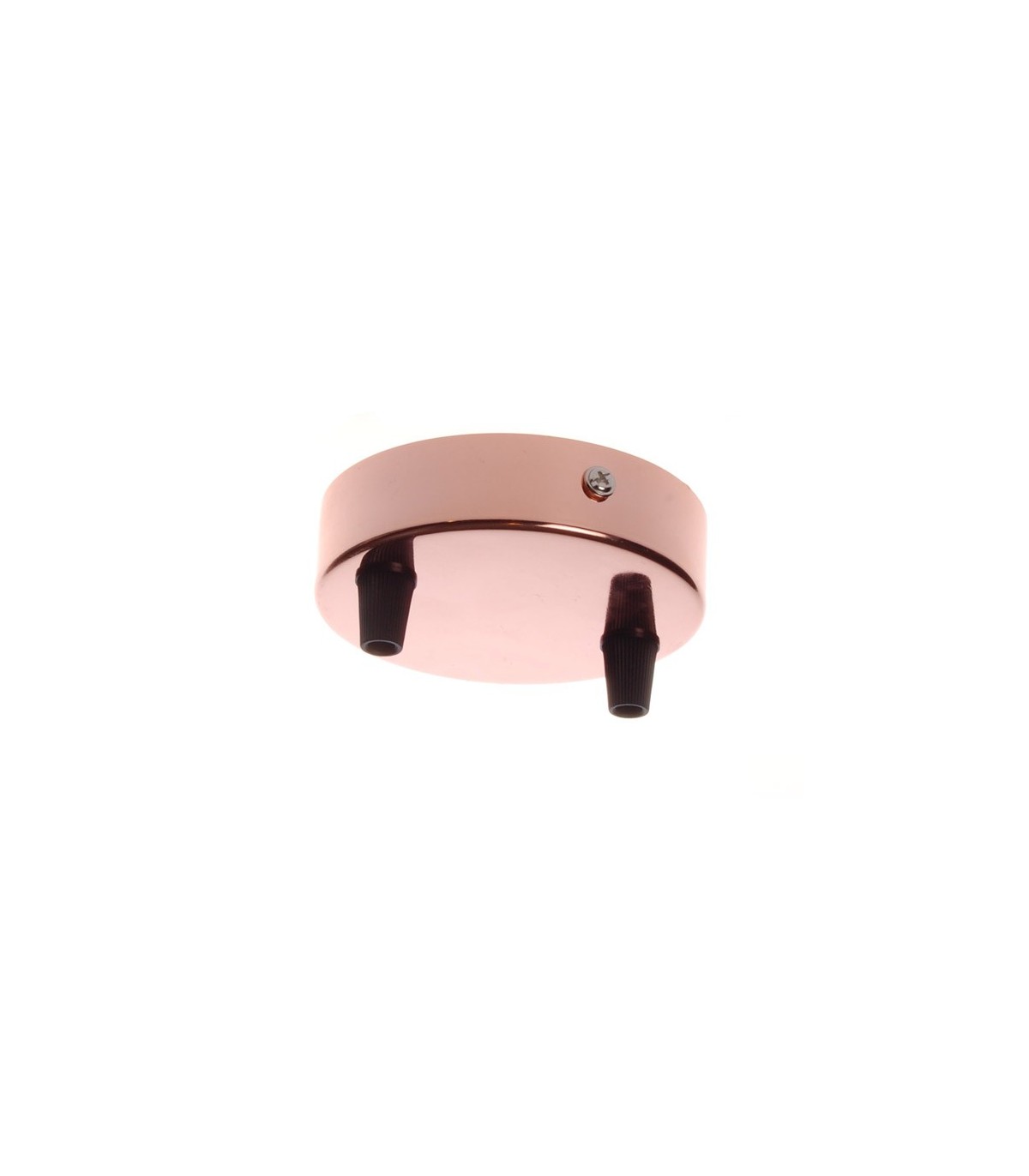Flat metal support in metallic colours, chrome, copper and gold, with two outlets for the installation of two lamps. Diameter 9 cm and 2 cm high. Installation by screws, includes fixing plate. Includes plastic cable gland. You can buy metallic cable glands in accessories. Don't forget your cable and accessories for attaching the cable to the ceiling.